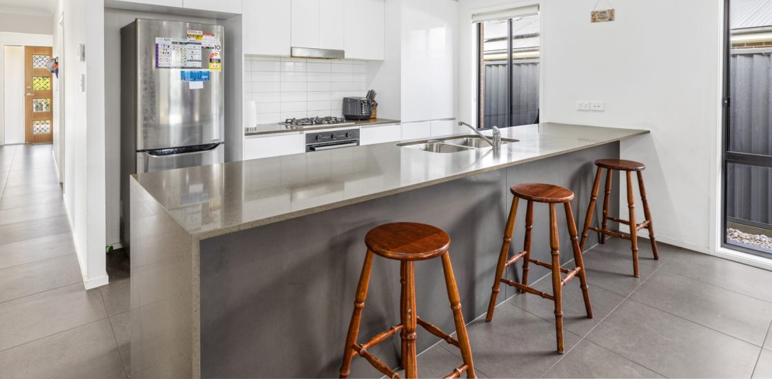 The contemporary kitchen is a chef’s dream, complete with smart stone benchtops, quality stainless steel appliances, and a gas cooktop. The main bathroom includes a built-in bath, providing a perfect spot to unwind, while stylish fittings and fixtures throughout, including wall-hung vanity units, add a touch of elegance.
