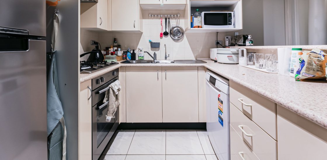 – Modern kitchen with quality appliances, stone bench top, gas cooktop and dishwasher.