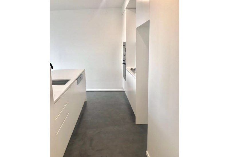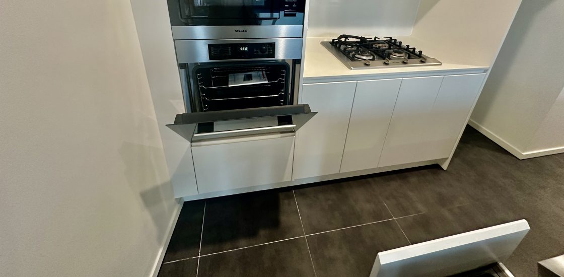 The apartment with 2.7m high ceiling. Kitchen is complete with gas cooking, island bench and plentiful storage, premium Miele appliances including a dishwasher. Bathroom with floor to ceiling tiles and semi frame-less shower.