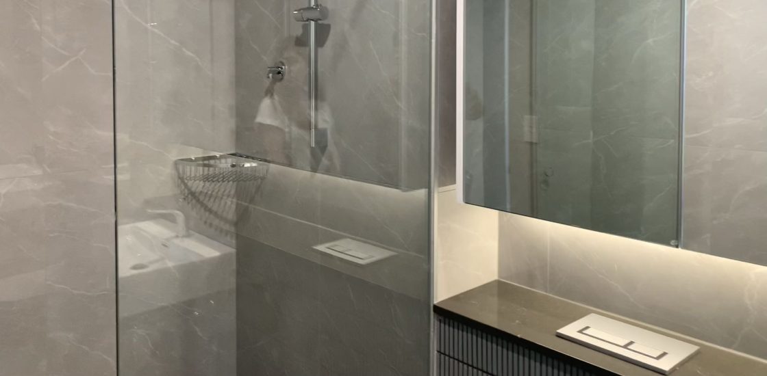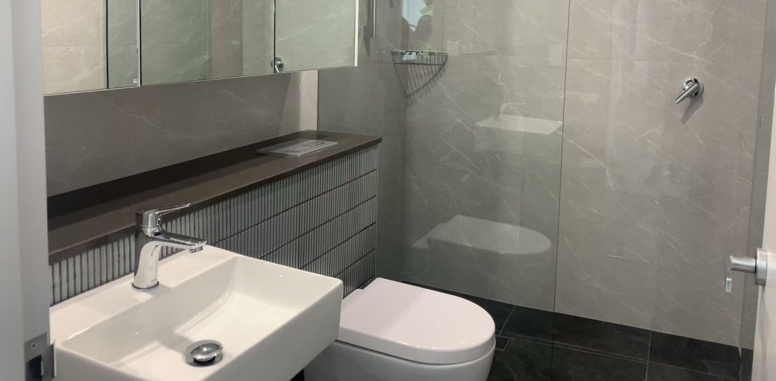 Stylish bathrooms and laundry with floor-to-ceiling tiles, wall-mounted basins, and concealed cisterns